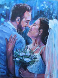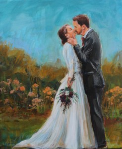 On the day I set up my easel and paints before your guests arrive to begin working on the under-painting. We arrange in advance a moment to take video and photographs of your chosen wedding ‘scene’. This might be during your ceremony, your walk back down the aisle, your first dance or whatever is special to you. I then paint live for up to 6 hours, quietly observing and capturing the atmosphere. Guests are welcome to watch, chat with me and even lay down a brush stroke!