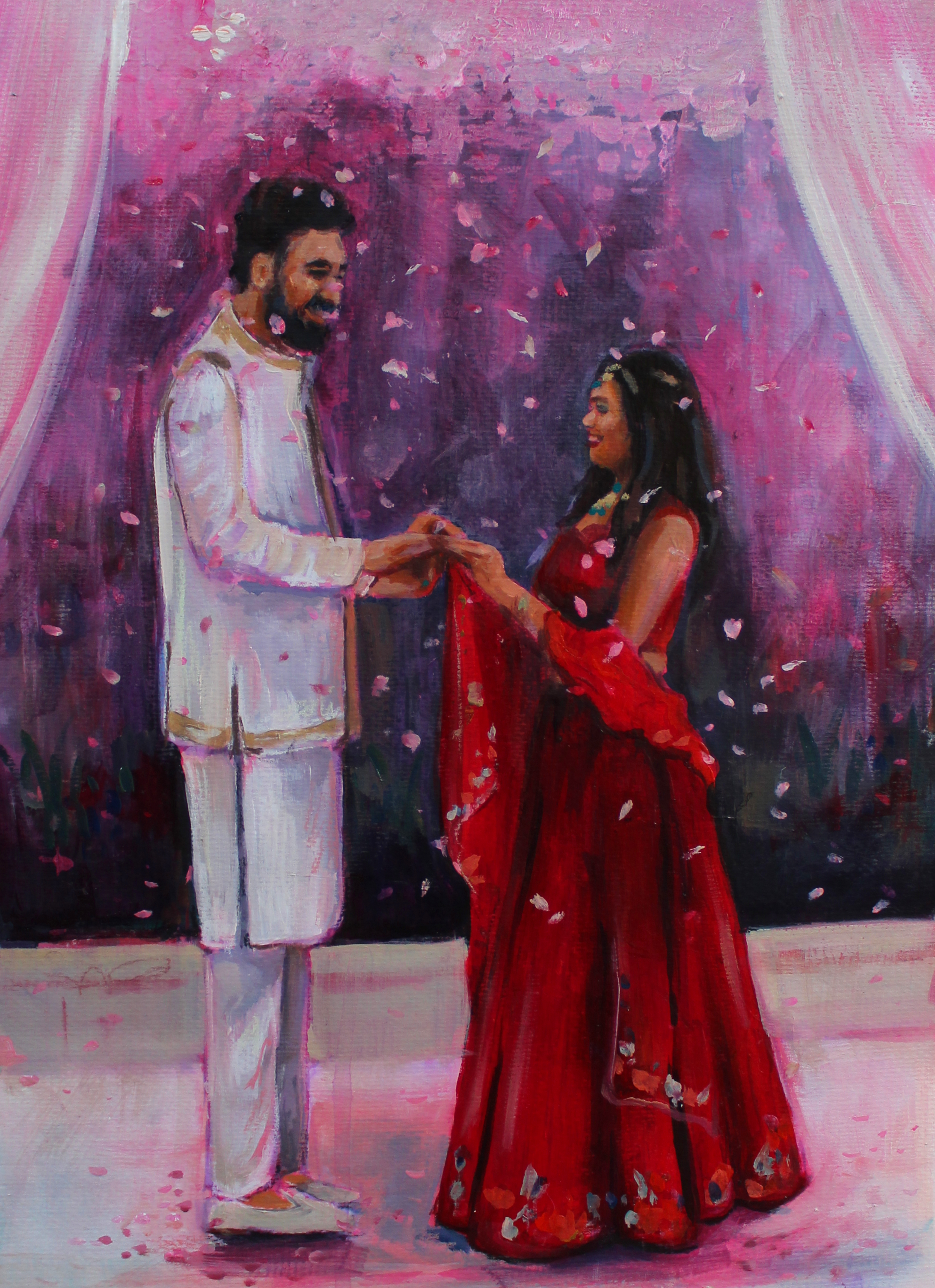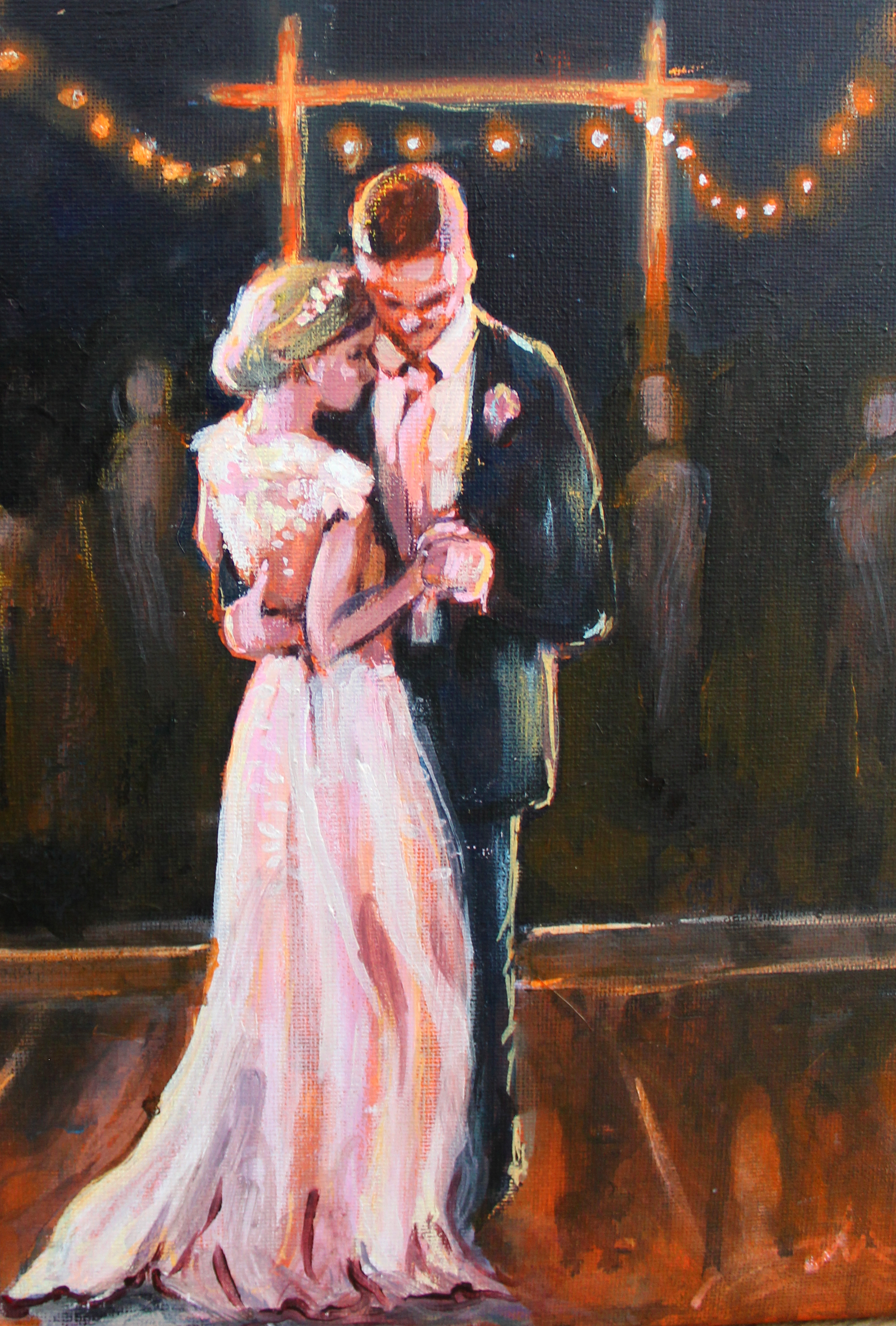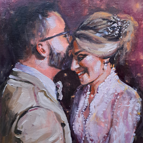On your wedding day, I paint live for up to six hours, working from reference photographs and video taken during the celebration. We agree the moment in advance, and I complete the final artwork in my studio using archival acrylic paints and varnish — creating a piece you can keep forever.