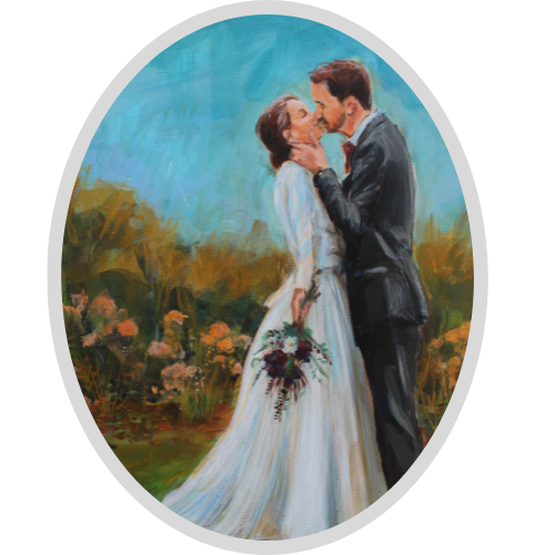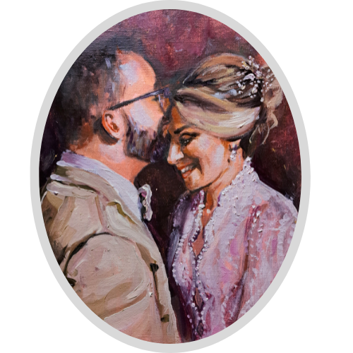 We’ll discuss your vision for the painting and choose the moment or atmosphere you’d love to capture on canvas — for example the ceremony, first kiss, or another meaningful scene.