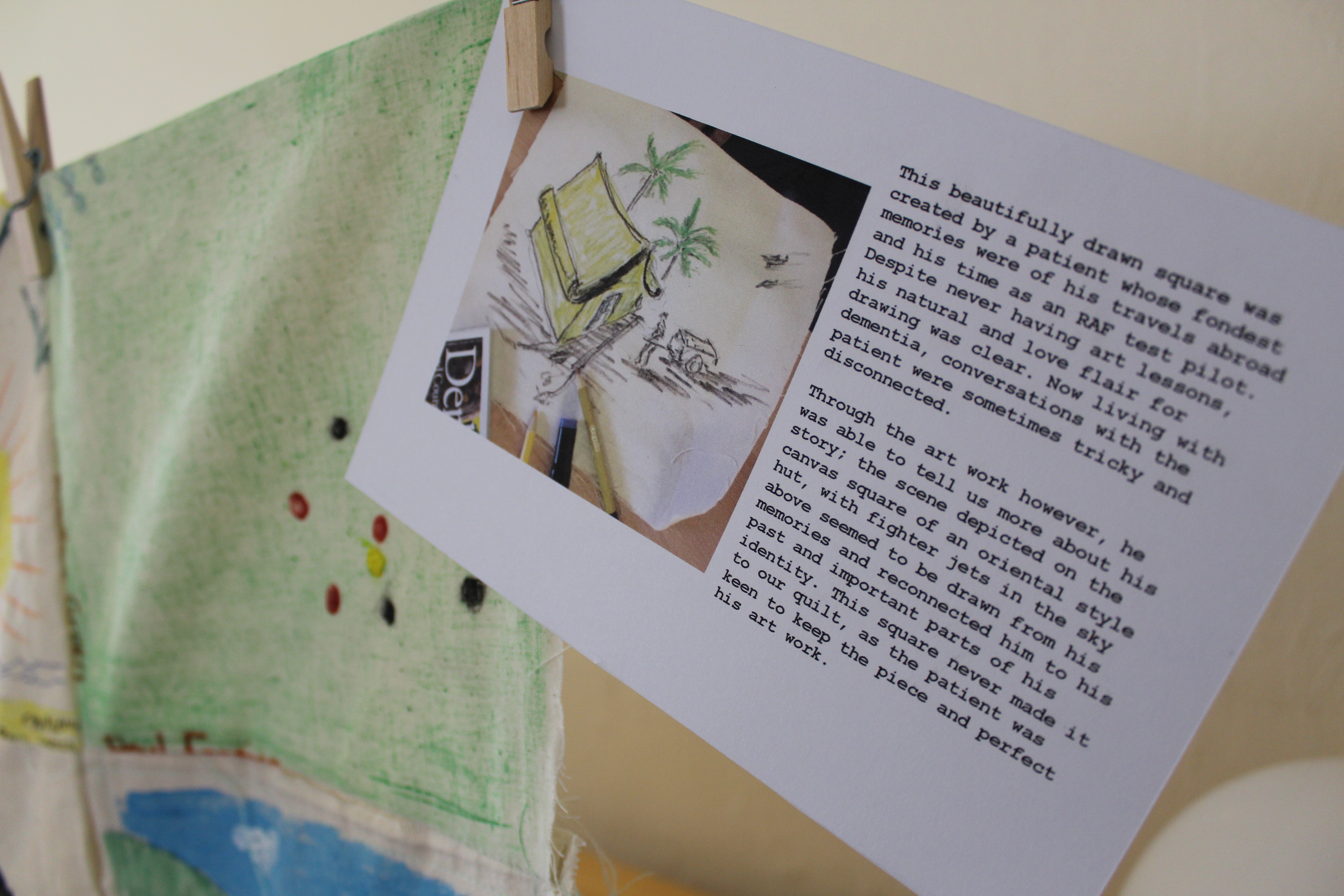 As I worked on the same 6 wards once a week for 8 months or so, I began to notice that each ward was an ever changing ‘micro-community’, with a culture of its own. Of the hundreds of patients that we engaged in our creative wellbeing projects, they were all linked by a common thread – yes they were in hospital due to illness/injury, but beyond their identity as a patient, they they all had a story to tell. The Whiffle Quilt began as a response to this, in an attempt to capture and represent the real people of the wards; to look beyond the clinical setting and shed light on the moments of human connection, community, love, loss and laughter. Participants in the project included patients, staff and visitors on the wards.